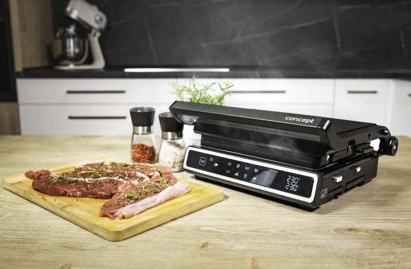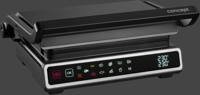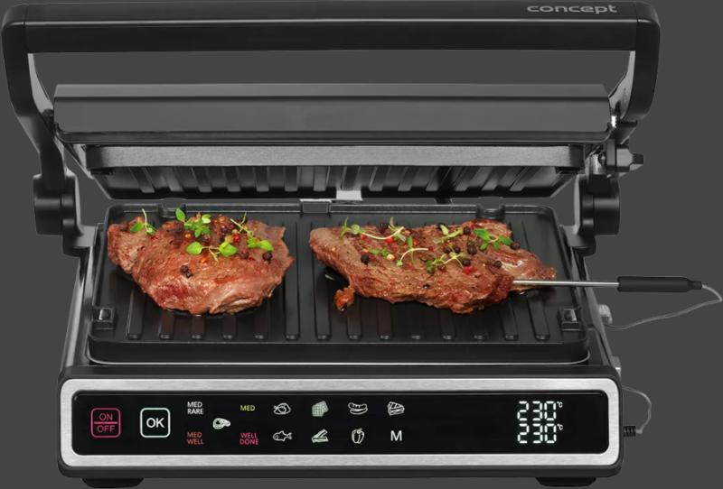A Concept GE3550 kontaktgrill beépített hőmérsékletmérővel van felszerelve. Ezt különösen értékelni fogja húsok grillezésekor, amely során figyeli a belső hőmérsékletet és az átsütöttségi fokot. Csak szúrja bele az ételbe, és figyelje a belső hőmérsékletet, amely megjelenik a grill kijelzőjén.