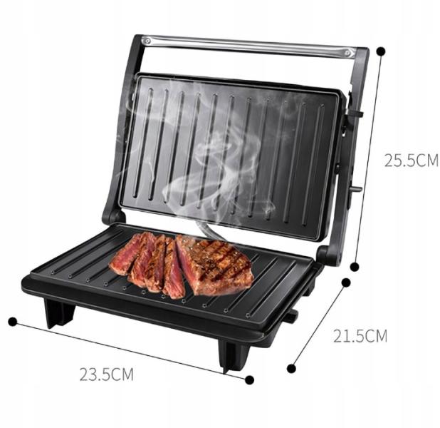 PTFE BEVONAT – Tapadásmentes A fűtőlapokat  PTFE bevonat borítja,  amely megakadályozza az étel tapadását és megkönnyíti a készülék tisztítását. Ennek köszönhetően  nem kell aggódnia az égett sajt, hús vagy zöldség miatt , mert a grillezés mindig problémamentes. Ha végzett a főzéssel,   egyszerűen törölje le a felületet egy ruhával , és a berendezés újra használatra kész. MŰSZAKI ADATOK