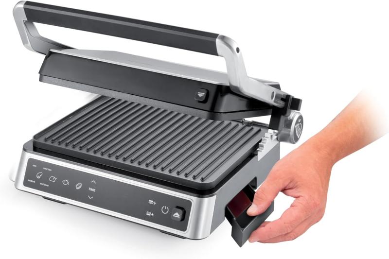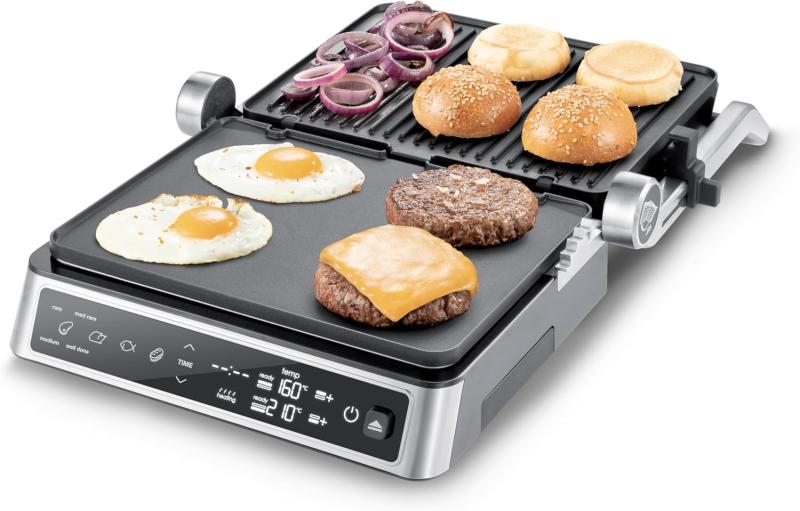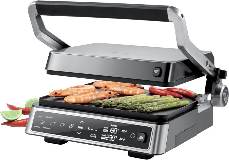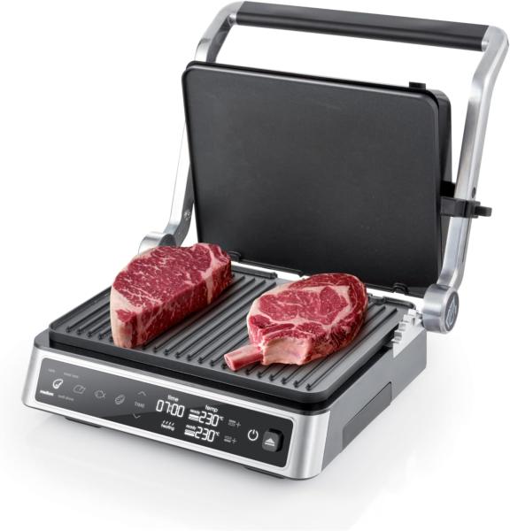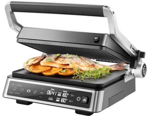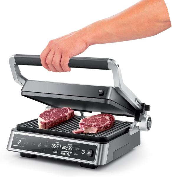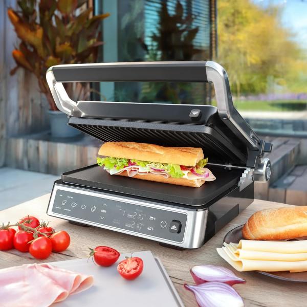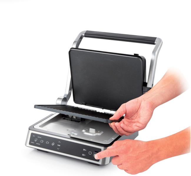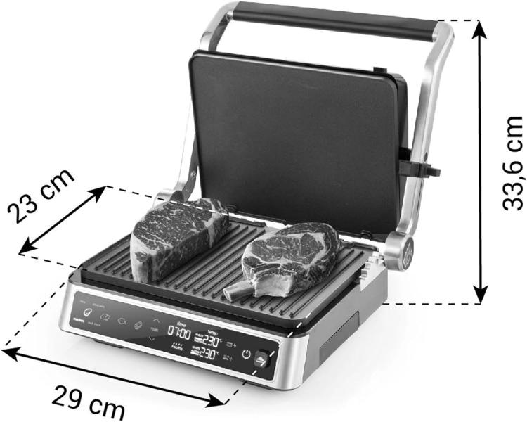 Digitális elektromos grill jól áttekinthető érintőképernyős kijelzővel, speciális programokkal steakek, szárnyasok, halak, pirítós és panini készítéséhez. A felső grillezőlap magassága állítható, a grill teljesen szétnyitható, ezáltal a grillezőfelület megkétszerezhető. A tapadásmentes bevonatú grillezőlapok kivehetők és könnyen tisztíthatók. Első osztályú rozsdamentes acélból, minőségi fémből és hőálló műanyagból készült.